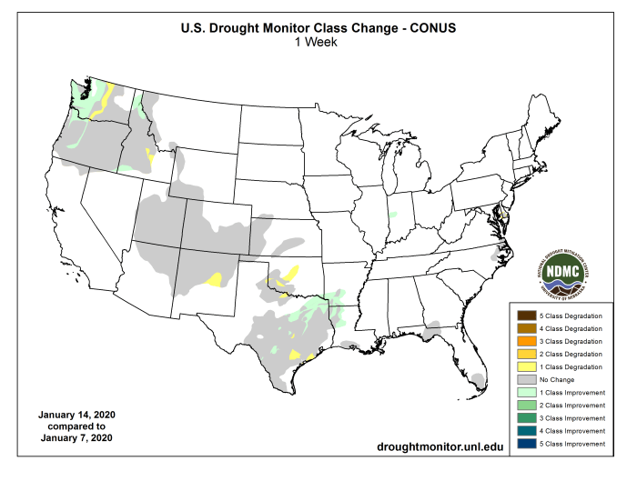 US Drought Monitor one week change map ending January 14, 2020.