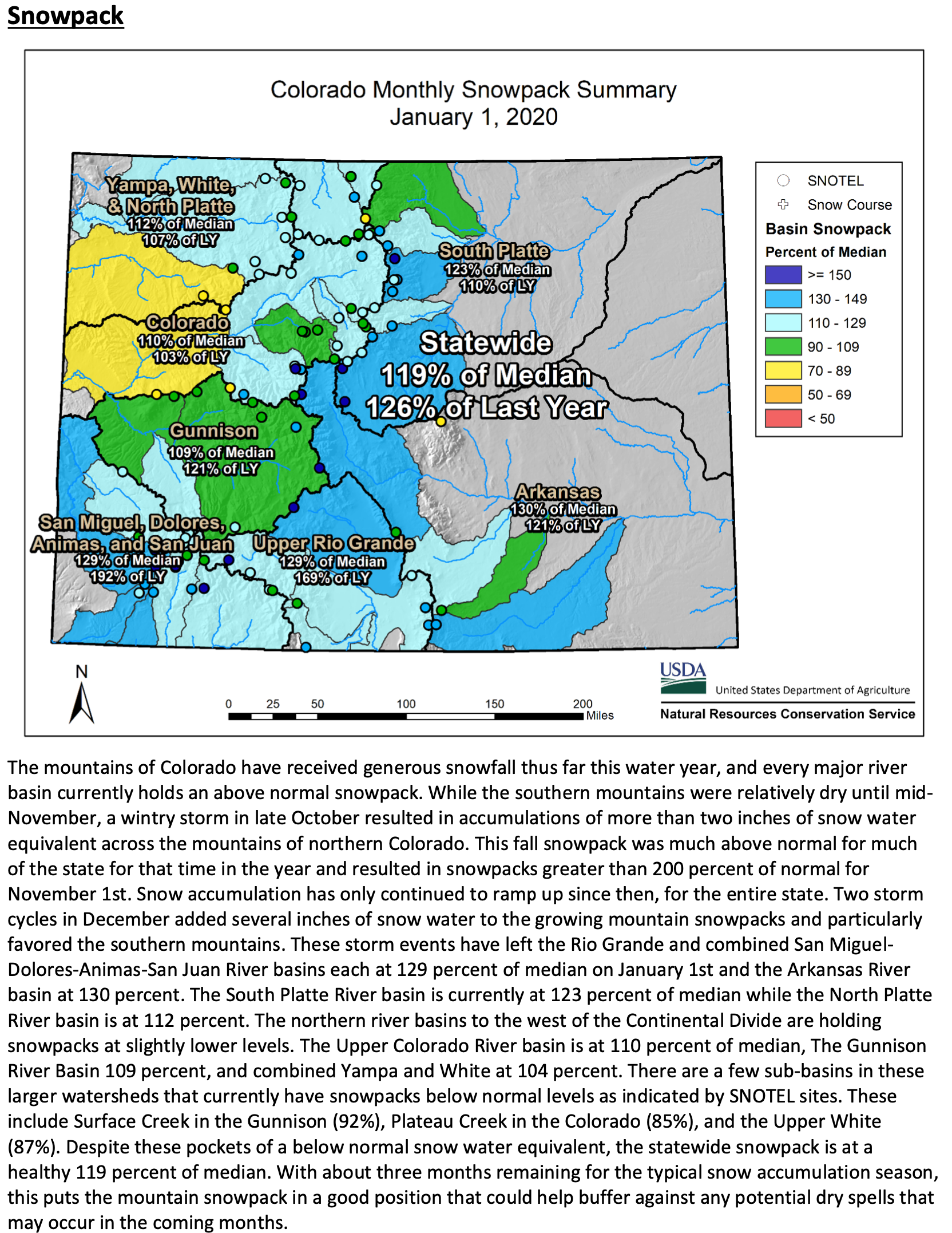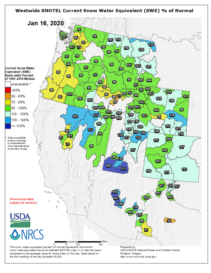 Westwide SNOTEL basin-filled map January 16, 2020 via the NRCS.