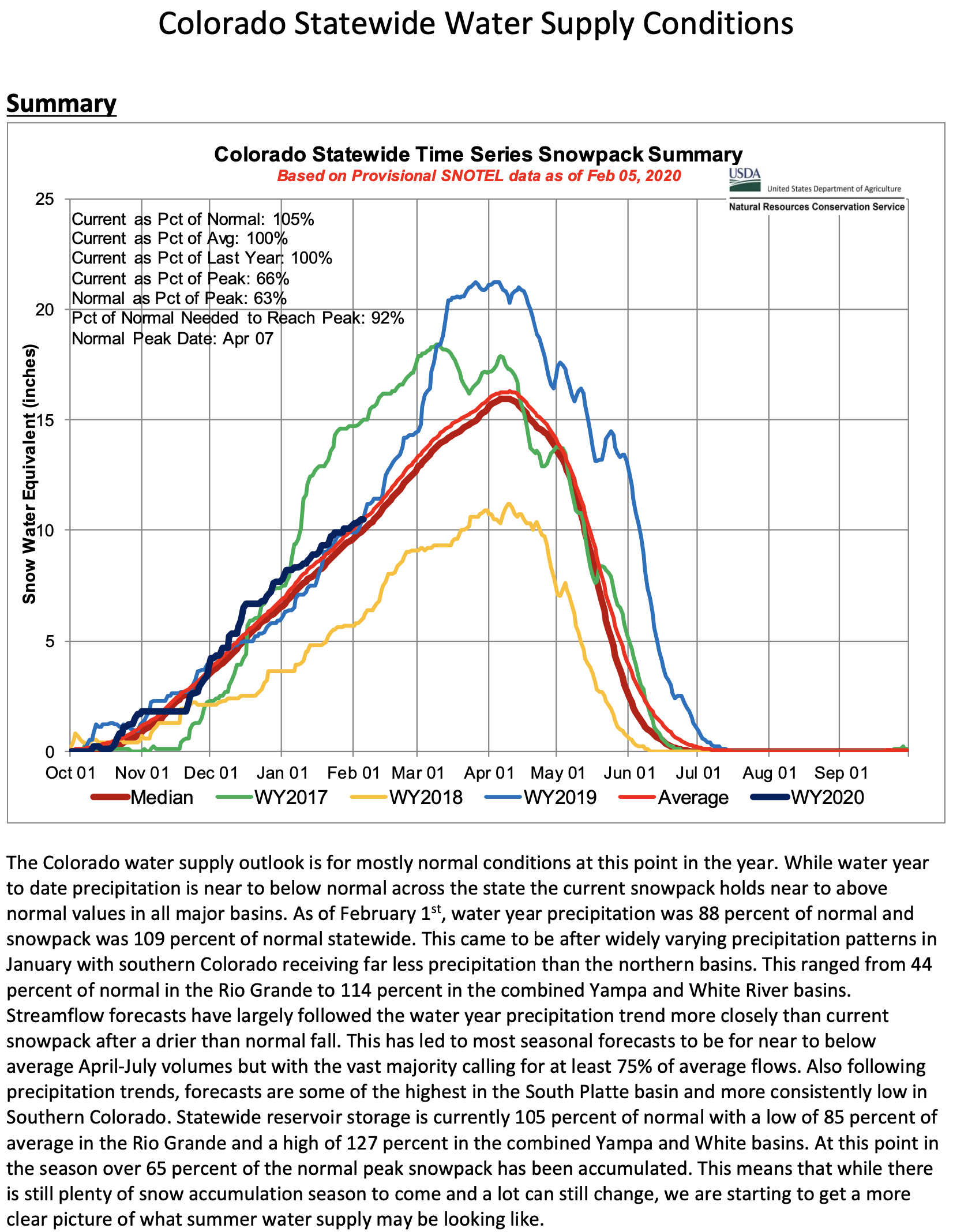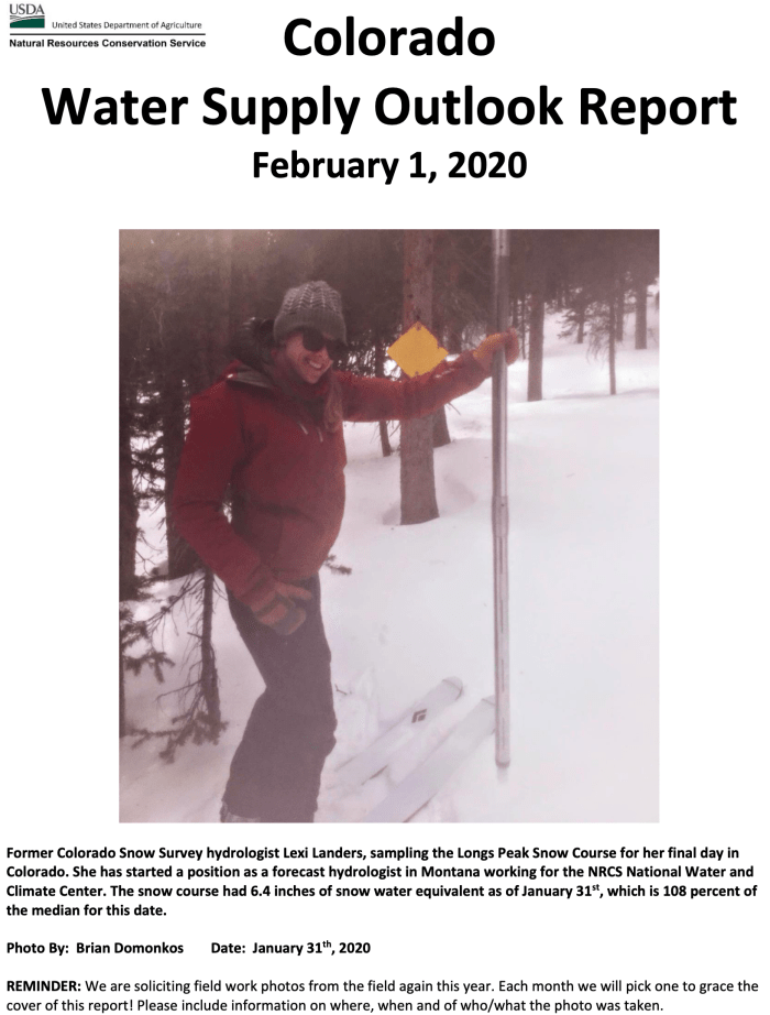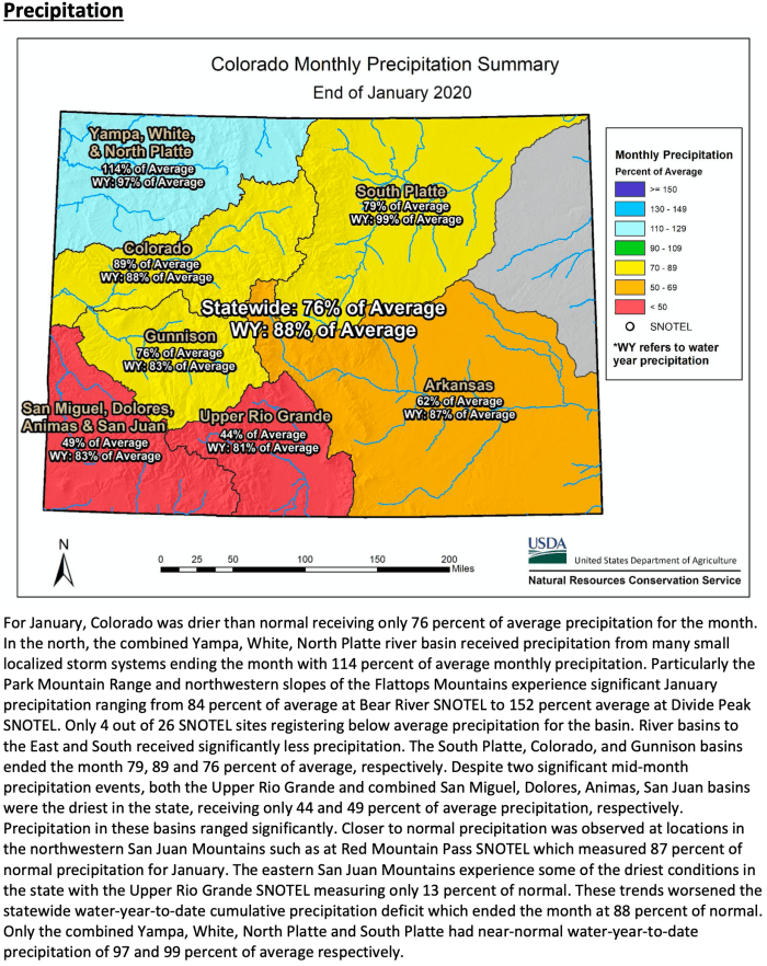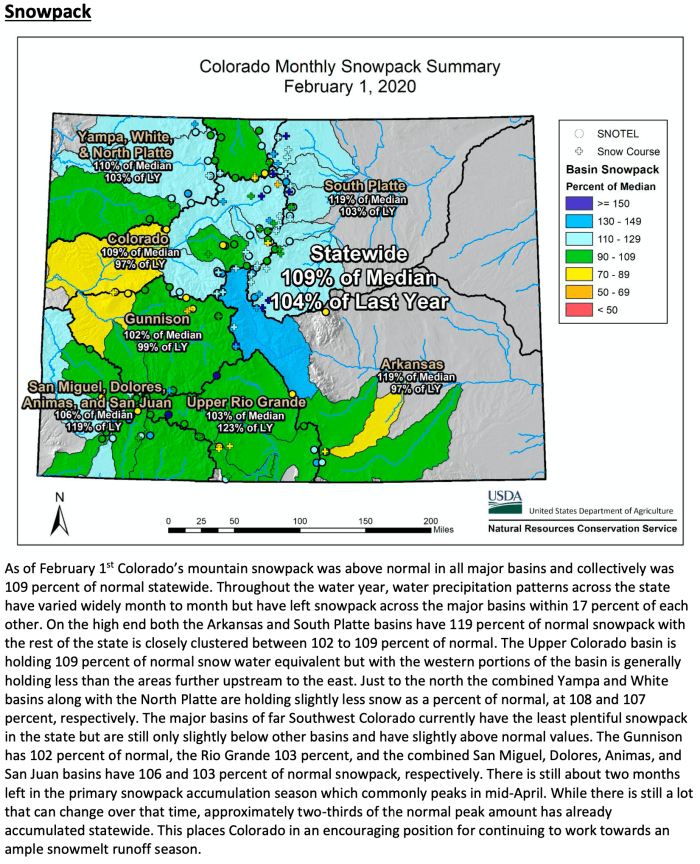 Water year 2020 has continued to be a mixed bag of conditions across Colorado and month-to-month. This has left the state with above normal snowpack and below normal water year precipitation. This came about after a dry October and early November before the start of the primary snowpack accumulation. “After a particularly dry late summer and fall, December provided substantial snow accumulation in Colorado. January then followed with mostly below average precipitation with southern Colorado being the driest, an area that received the most accumulation in December” notes NRCS Hydrologist Karl Wetlaufer. Statewide snowpack was 109 percent of normal on February 1st and water year to date precipitation was 88 percent. While above normal snowpack exists across the state the precipitation deficit leading to and entering winter have led streamflow forecasts to be mostly below average across the state. Forecasts have overall been following precipitation trends across the major basins of the state.