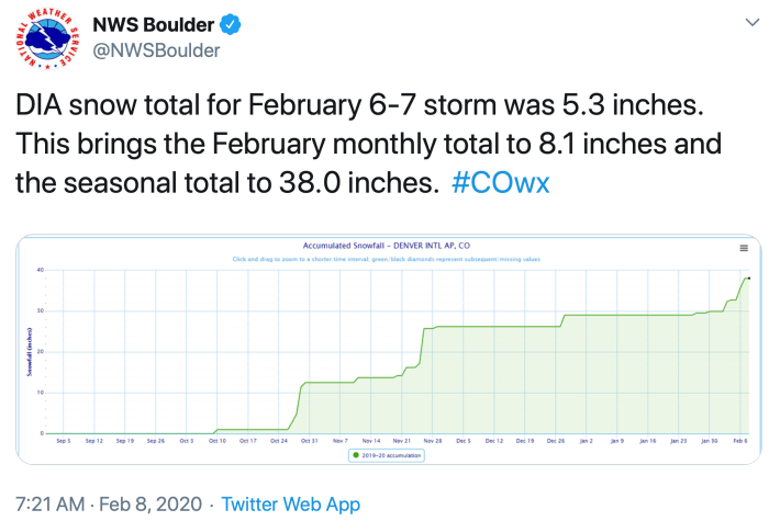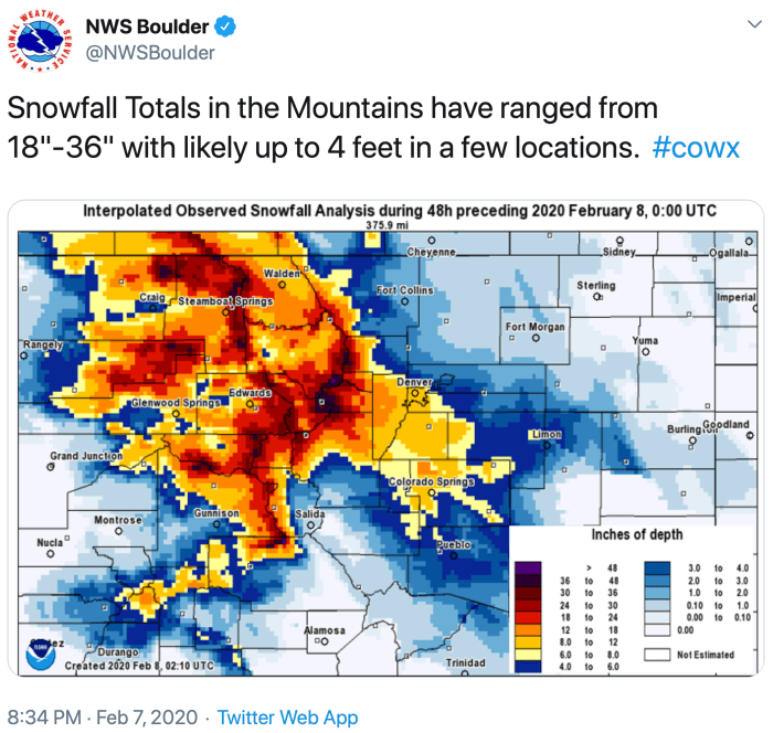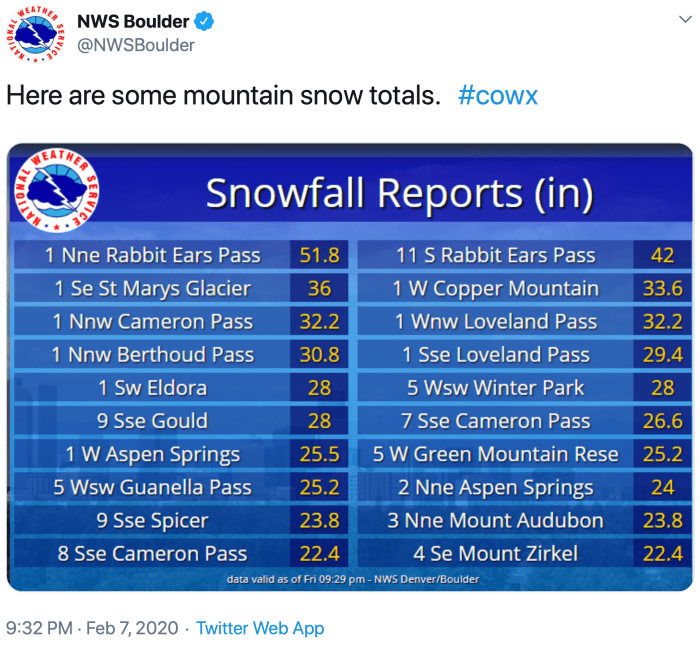Loveland pass saw more than 32 inches of snow by Friday evening, data from the National Weather Service showed. Rabbit Ears pass received more than 50 inches, Copper Mountain more than 33 inches and parts of Littleton 12 inches.