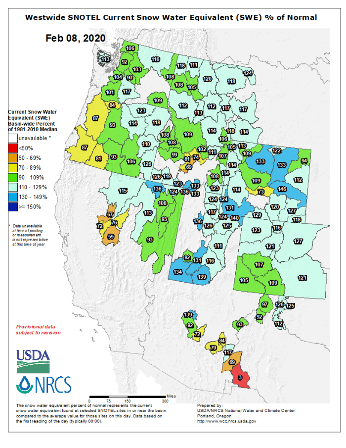 Westwide SNOTEL basin-filled map February 8, 2020 via the NRCS.