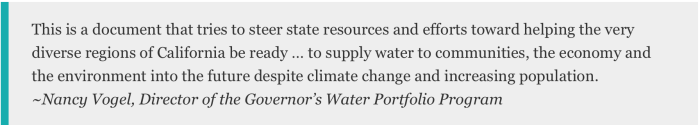 NANCY VOGEL: It’s a high-level policy planning document, much like the Water Action Plan was for the Brown administration. It sets forth our priorities and it’s the blueprint for state agencies working on water. I’ve been impressed with just how much time and energy people have put into providing us input and making sure that it’s on the scale we need.