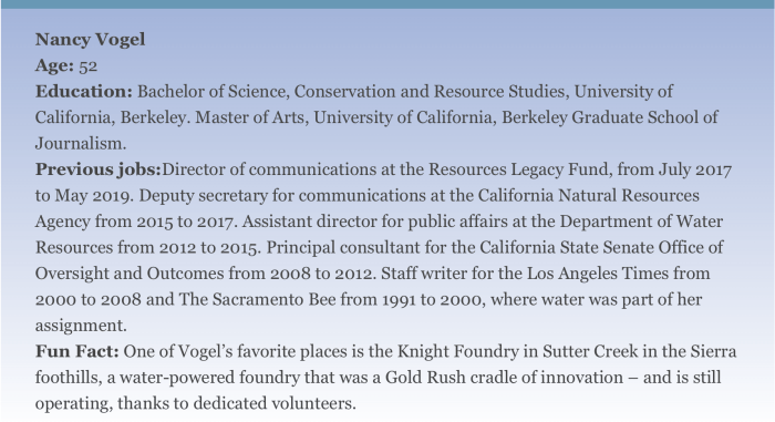 WESTERN WATER Q&A: FORMER JOURNALIST NANCY VOGEL EXPLAINS HOW THE DRAFT CALIFORNIA WATER RESILIENCE PORTFOLIO CAME TOGETHER AND WHY IT’S EXPECTED TO GUIDE FUTURE STATE DECISIONS