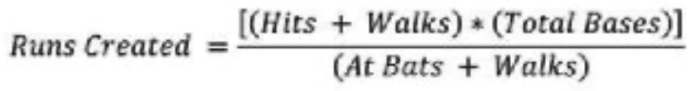 In the 1980s, Bill James pioneered the concept that the traditional baseball data was in fact not representative of the performance of players and the sport. While statistics in baseball have been around for generations and the availability of data staggering, according to James the statistics being employed were not meaningful assessments of team or individual performance. They also failed to provide any guidance or insight into the operations of the teams. For example, the number of hits achieved by a player is not truly reflective of the effectiveness of a hitter. James’ notable insight was existing data could be combined in new ways to generate something more useful than traditional metrics. In this case, James proposed a mathematical formula to determine how many runs a hitter creates: