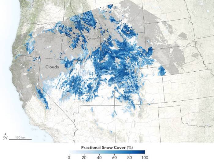 In 2018, snowpack in the Rocky Mountains was much lower than usual. Credit: Joshua Stevens/NASA Earth Observatory