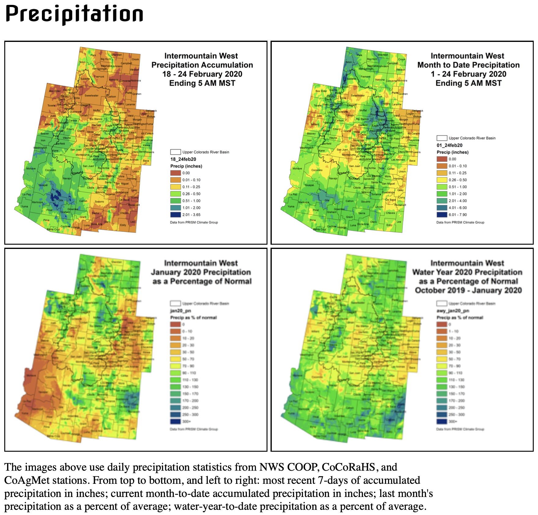 Temperature in the northern half of the IMW were colder than average and a little bit warmer to the south. Overall, a lot of February has been a bit cool for the IMW. Snowpack is still in good condition, with the northern basins well over the median for snowpack at this time of year. The central UT mountains, the San Juans, and the southern mountains in Arizona are a bit lower on snowpack, hovering near normal to slightly below normal.