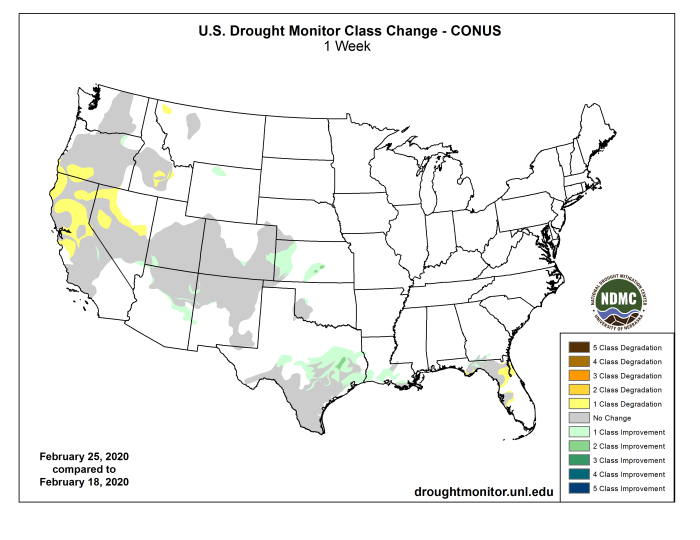 Although the California statewide average reservoirs were 104% of normal for this time of year, the timing of the precipitation deficiencies are just as important as the magnitude in California. According to California State Climatologist Michael Anderson, February is an important month as temperatures begin to warm and rangeland comes out of winter stasis. With late rains, germination was delayed, and now with little or no rain in February, it will be difficult for rangeland to develop the nutrients necessary for good forage. Expectations are that rangeland conditions will be poor or very poor, and supplemental feeding required. Reports from the field have already mentioned that some rangeland and pastures have already headed out, meaning that they completed their annual life cycle and won’t produce any more biomass, something that normally happens in late April or May. A report from northern California mentioned blowing dust when checking their herd – while blowing snow would be the norm. The latest USDA/NASS February report for California had topsoil moisture 25% very short, 40% short, and 35% adequate. Subsoil moisture was 10% very short, 50% short, and 40% adequate. Some areas are considering irrigation due to the dry weather, and cattle continued to be provided supplemental feed. With numerous non-managed 7-day averaged USGS stream flows in the lower tenth percentile (much below normal) in southwestern Oregon and the northern half of California, and non-irrigated lands already being impacted, D0(S) was expanded into northwestern and west-central California and northwestern and central Nevada. Where short-term conditions (60-days; SPIs at D2-D4) and WYTD conditions (120-days; SPIs at D1-D2) were the worst, D1(S) was added in central California and the Sierra Nevada, southern Oregon, and west-central Nevada. Fortunately, the long-term hydrologic conditions were much better, with California statewide reservoirs at 104% of normal as of Feb. 25. In southern Idaho, D2(SL) was added to the Big Wood, Little Wood, and Lost River basins. In northwestern Montana, a small D0 was introduced from Kalispell to Eureka based upon 90-day indices as SWC and WYTD precipitation is below normal, possibly due to a precipitation shadow effect from this winter’s dominant flow patterns.
