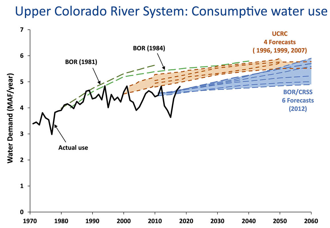 Since the 1980s, Bureau of Reclamation and the Upper Colorado River Commission have developed many scenarios of possible future consumptive use for the Upper Colorado River basin (Figure 1, dashed colored lines). Each scenario describes one possible trajectory of future consumptive water use out to the year 2040, 2050, and 2060. When averaged over the long term, each scenario of future consumptive use over-estimated the observed consumptive use reported by Bureau of Reclamation in its regular Colorado River Consumptive Use and Loss Reports (Figure 1, solid black line). Many other water systems also consistently overestimate their demands (Heberger, 2016; Kindler and Russell, 1984). Additionally, the trace of observed use has many more year-to-year variations due to changing precipitation and out-of-basin exports than the forecast scenarios. The disparity between the scenarios of possible future consumptive use and observed use show the inherent difficulties and uncertainties to estimate future demands and develop scenarios that span all possible future conditions. Thus, it is better to develop more scenarios to cover a wider range of future conditions. However, including more scenarios also increases the computational burden of analysis.
