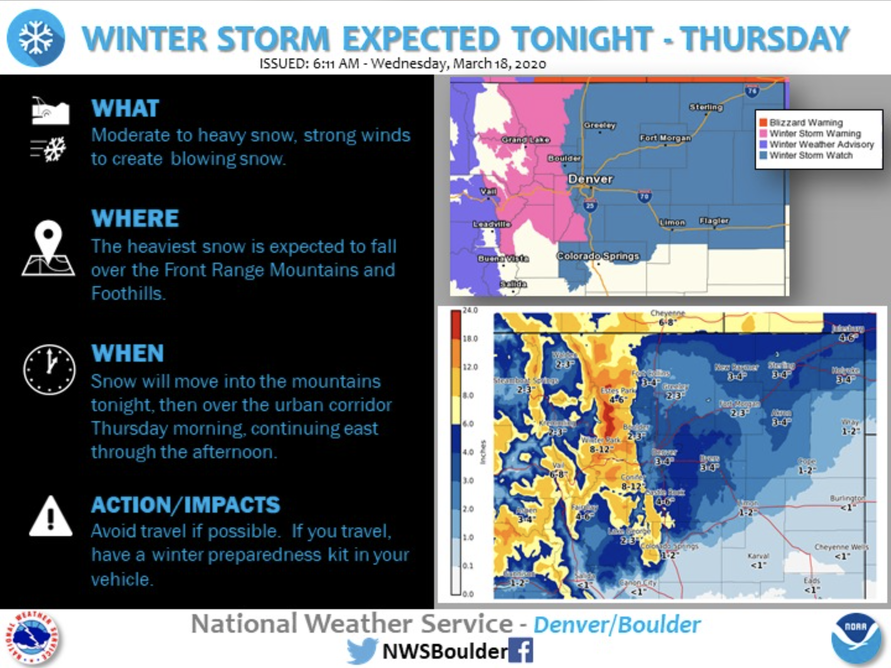The National Weather Service issued Tuesday afternoon a winter storm watch for much of the northeastern quadrant of the state, including Fort Collins and Denver, from 10 a.m. Thursday through 6 a.m. Friday…