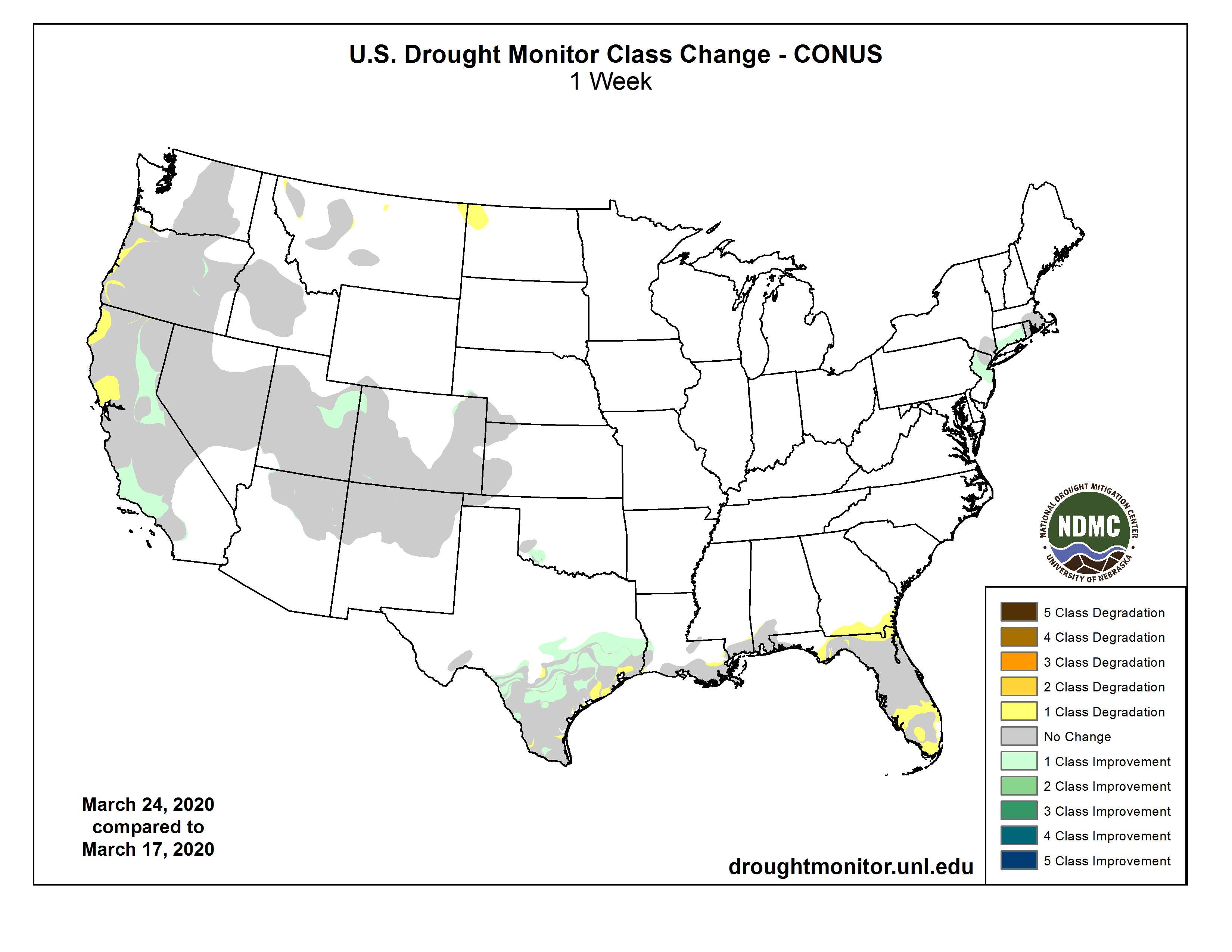 US Drought Monitor one week change map ending March 24, 2020.