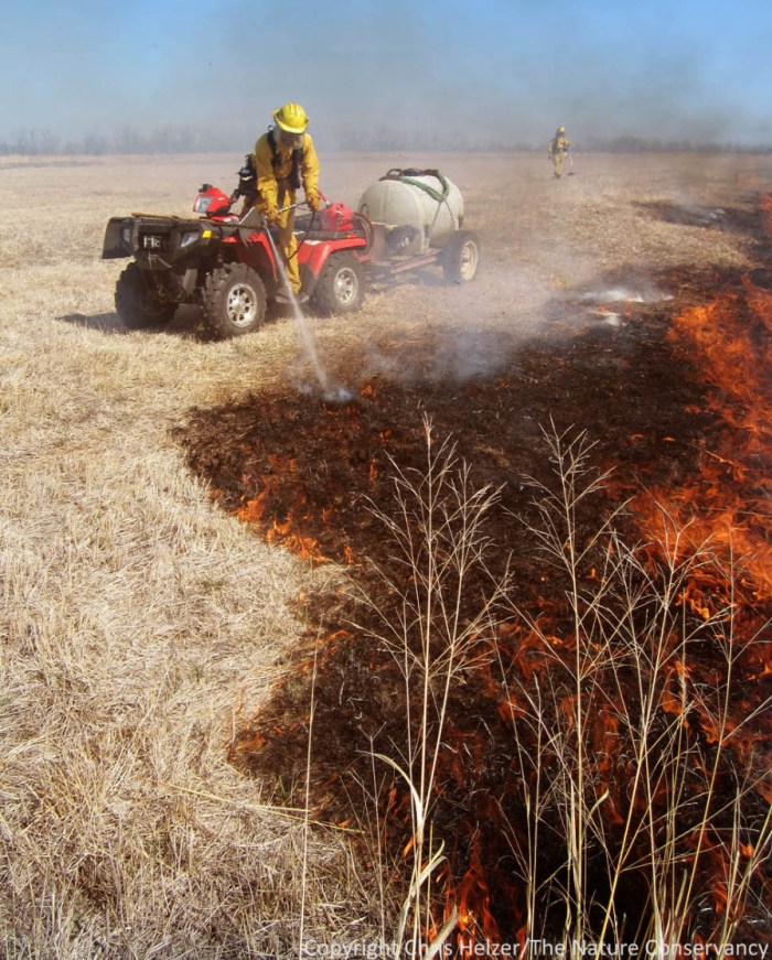 There’s nothing playful about safe and effective prescribed burning. Too many things can go wrong to take it lightly. Sometimes, I think people see prescribed fire as something that needs to be done to maintain prairies, but they can’t necessarily point to specific objectives for a particular fire. Nor can they describe what kind of burning (season, intensity, size, ignition pattern) is needed to achieve those objectives. Falling into the trap of burning because it seems like the right thing to do leads to two big risks. First, there’s a good chance that the fires will not be conducted in a way (or at the right time of year) that do much good – and could even be counterproductive. Second, because prescribed fire can be a hazardous activity, conducting one without clearly defined reasons means taking big risks for no good reason. A prescribed fire we conducted last week. This one went off without a hitch. Most of them do.. Nelson Winkel spraying backing fire. TNC Platte River prescribed burn crew 2012. Platte River Prairies, Nebraska.