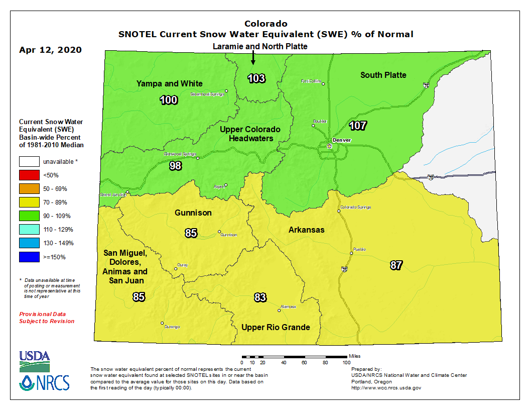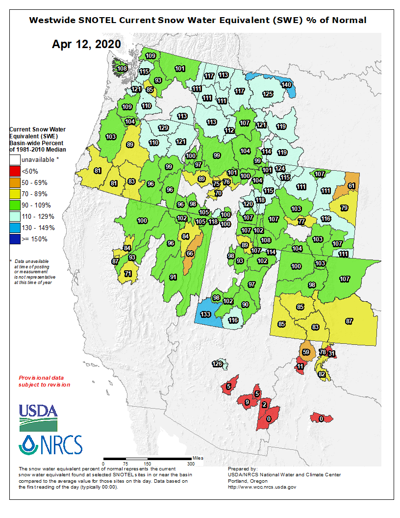 Westwide SNOTEL basin-filled map April 12, 2020 via the NRCS.