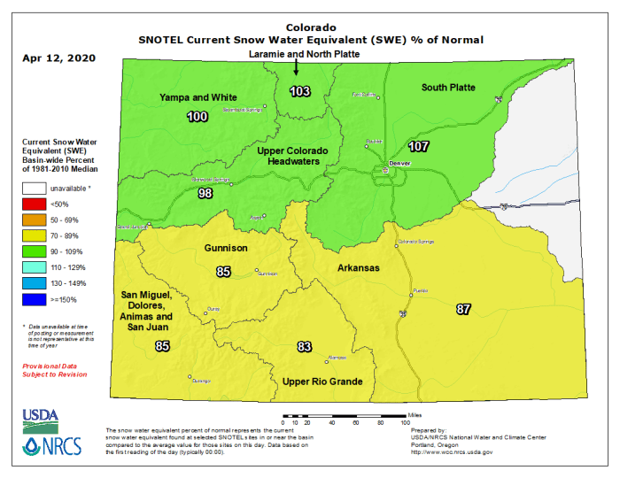 Colorado snowpack basin-filled map April 12, 2020 via the NRCS.