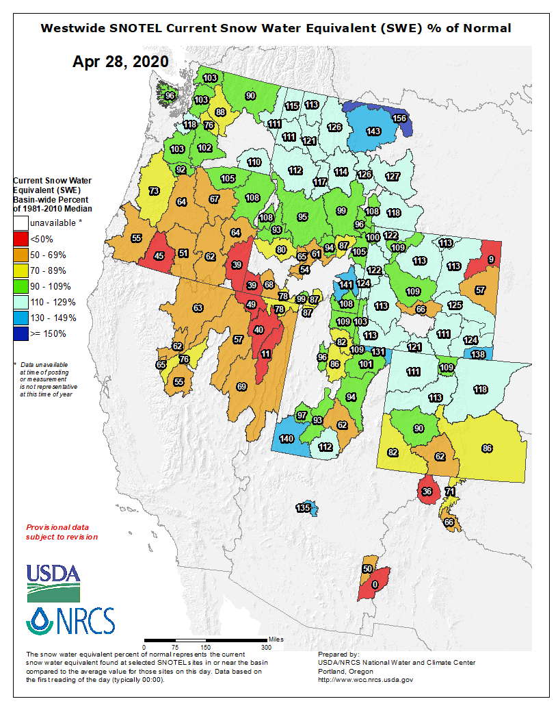 Westwide SNOTEL basin-filled map April 28, 2020 via the NRCS.