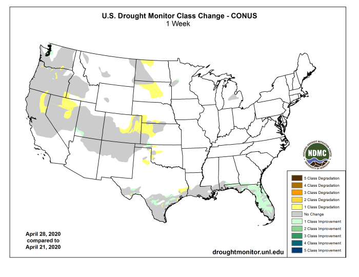 Temperatures across the High Plains were generally warmer than normal last week with departures of 2 to 6 inches above normal. Much of the region received less than 0.5 inches of precipitation. Exceptions included parts of eastern North Dakota, South Dakota, and Nebraska, with totals of more than 1 inch, and eastern Kansas, with amounts of more than 2 inches – nearly 200% of normal. The warm, dry conditions led to an expansion of abnormal dryness (D0) in the Dakotas, southwest Nebraska, northwest Kansas, and eastern Colorado. Additionally, moderate and severe drought (D1 and D2) expanded over Colorado’s eastern plains. This area has failed to receive the timely spring rains needed, resulting in reductions in soil moisture, streamflow, and vegetation health. Across the entire High Plains region, local drought experts are discussing the emerging dryness and closely monitoring the situation as planting begins and the need for moisture increases…