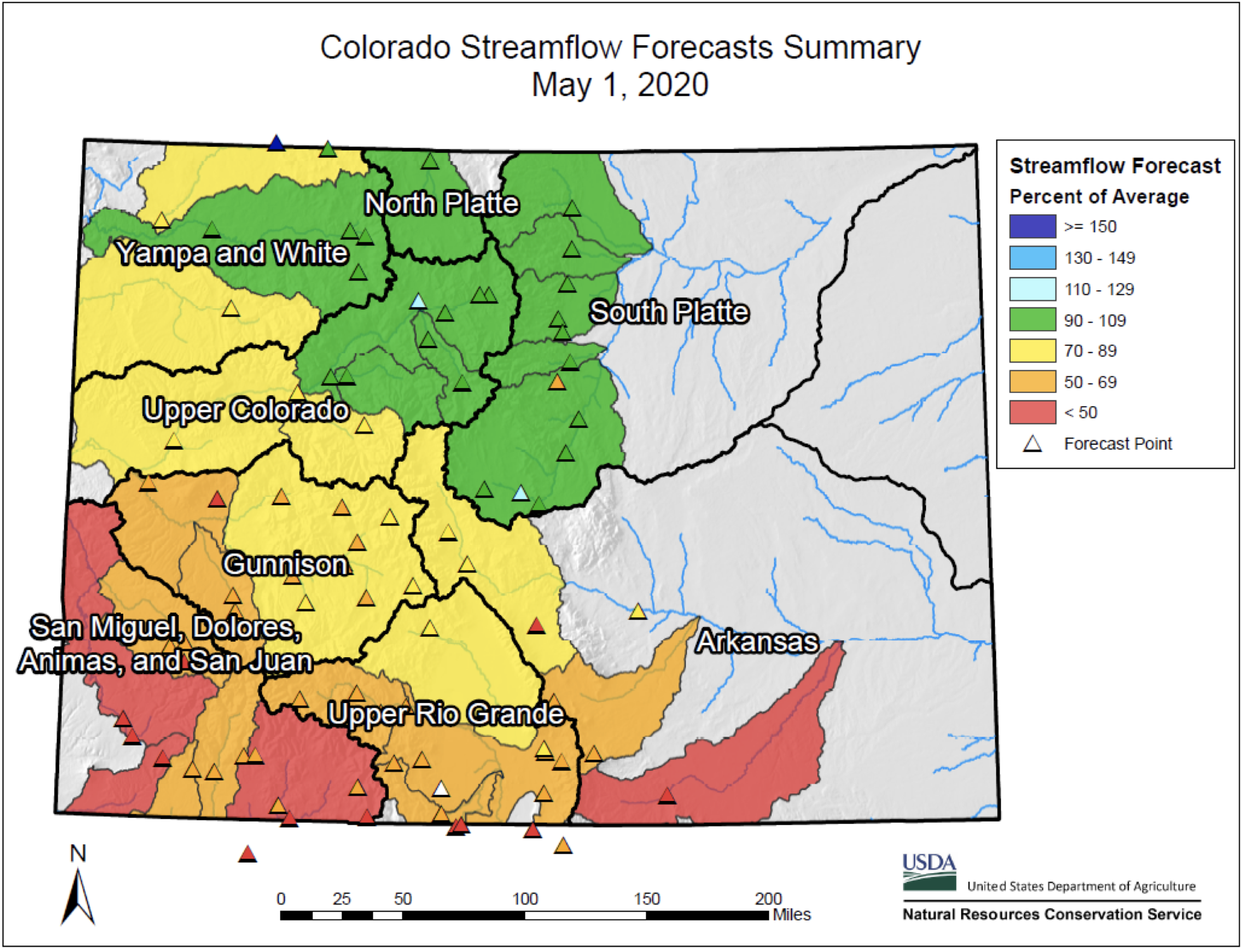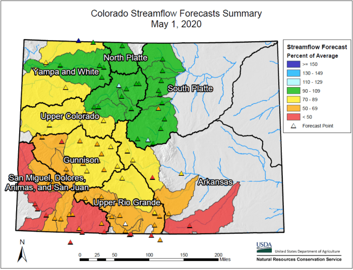 The month of April brought below average precipitation across all of Colorado with extremely dry conditions in southern Colorado in particular. All major basins in the southern half of the state received less than 50 percent of average precipitation with the Rio Grande at the bottom of the list with a meager 16 percent of average. Most SNOTEL sites in the San Juan and Sangre de Cristo Mountains recorded the lowest or second lowest April precipitation on record. The basins of northern Colorado all received between 77 and 84 percent of average precipitation. “The precipitation differences across the state have caused notable changes to streamflow forecasts across the state since the beginning of April. Considerable declines in streamflow forecasts were observed across southern Colorado over the last month,” states NRCS Hydrologist Karl Wetlaufer. On average streamflow forecasts dropped 10-15 percent in the Rio Grande and combined San Miguel, Dolores, Animas, and San Juan basins and more in some southern tributaries to the Arkansas.
