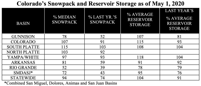 In addition to the past month the 2020 water supply situation is further complicated by conditions leading into the winter season. The late summer and fall of 2019 was also extremely dry leading to very low soil moisture conditions going into winter which can have an effect on the efficiency of snowmelt runoff. Wetlaufer notes that “Dry soils underlying the snowpack can absorb much of the snowmelt in the spring which has the potential to substantially decrease the amount of water that actually makes it to a stream channel to contribute to runoff”. Because of this effect it is anticipated that streamflows will be less than are commonly observed in other years with a similar snowpack peak and particularly in the southern half of the state. Statewide snowpack peaked on April 4th at 103 percent of normal but snowpack accumulation and melt patterns varied widely across the state after that point.