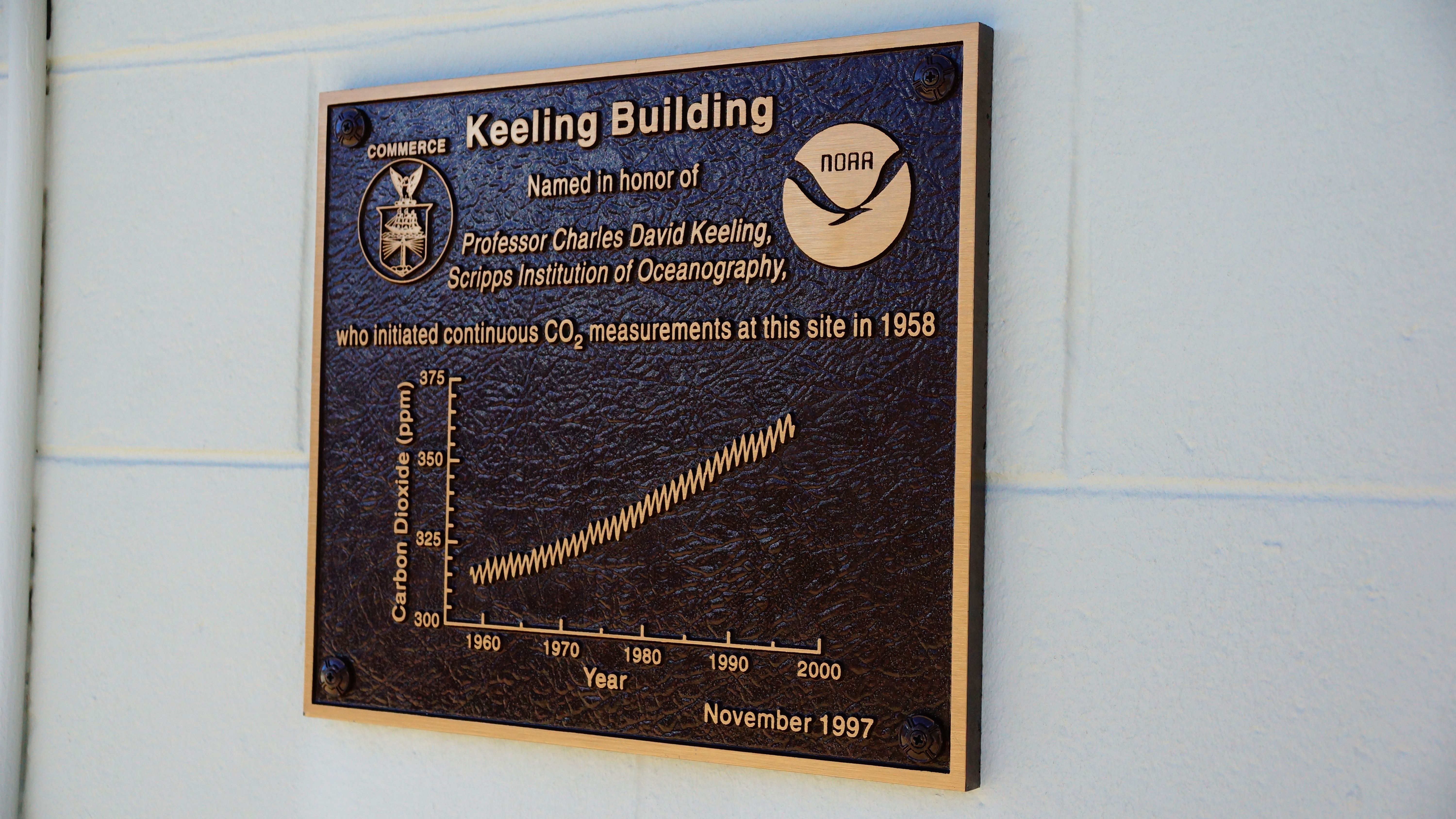 This plaque is fixed to the original building where C. David Keeling began taking carbon dioxide measurements near the top of Mauna Loa in 1958. Credit: Susan Cobb, NOAA.