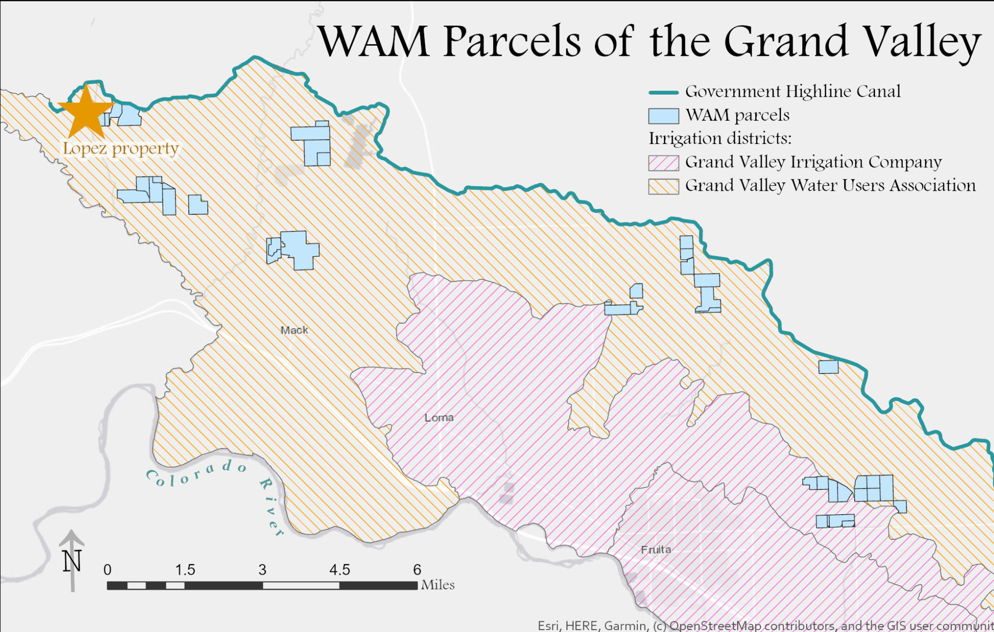 Since 2017 Water Asset Management has bought 1,659 acres of land in the delivery area of the Grand Valley Water Users Association. Their most recent purchase was of land irrigated by the Grand Valley Irrigation Company Canal. Credit: Kaitlin Ketel w/Mesa County parcel data via Aspen Journalism