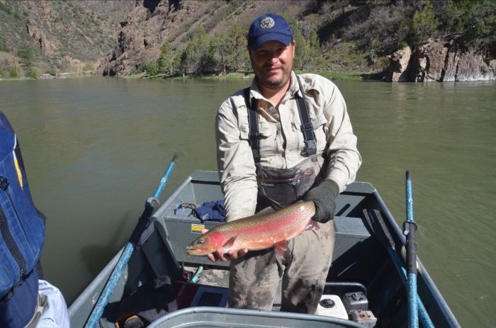 In the Gunnison River gorge, CPW Aquatic Biologist Eric Gardunio, holds a whirling-disease resistant rainbow trout. CPW is stocking fish resistant to the disease throughout the state. Photo credit: Colorado Parks and Wildlife