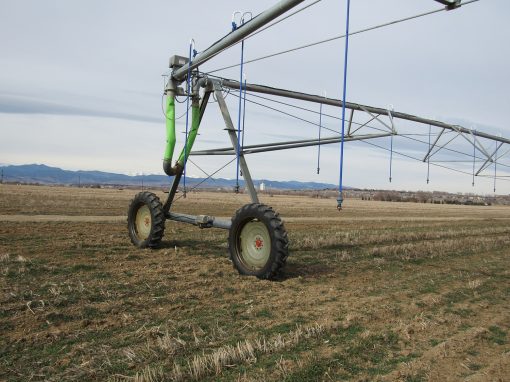 An irrigation system known as a center pivot sprinkler sits in a field near Longmont, Colo. The systems have helped Colorado use its farm water more efficiently, but state use still exceeds the national average. Credit: Jerd Smith via The Fresh Water News (Water Education Colorado)