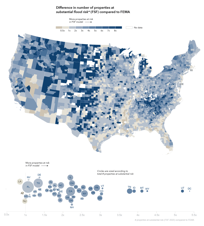 Overall, the results, which cover the contiguous United States — including areas the government hasn’t yet mapped for flooding, and places where the federal maps are decades old — show a vast increase in risk compared with official estimates. Many inland areas, including swaths of Appalachia and numerous major cities, saw big jumps.