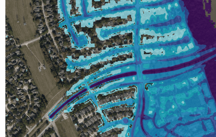 Houston, Texas: 3m resolution, 1 in 100 annual flood risk or 1% for the year 2020. Graphic credit: First Street Foundation