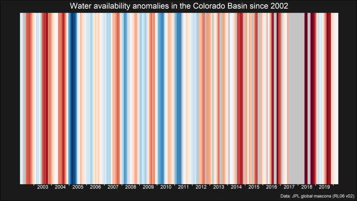 This project is based on and inspired by @ed_hawkins’s awesome #ShowYourStripes global warming awareness-building initiative. Although global water availability has been tracked for a much shorter period of time (only since 2002) compared to temperature, these water availability stripes can help to raise the profile of global water security challenges and complement the #WarmingStripes initiative by bringing attention to the linkages between water availability and climate change.