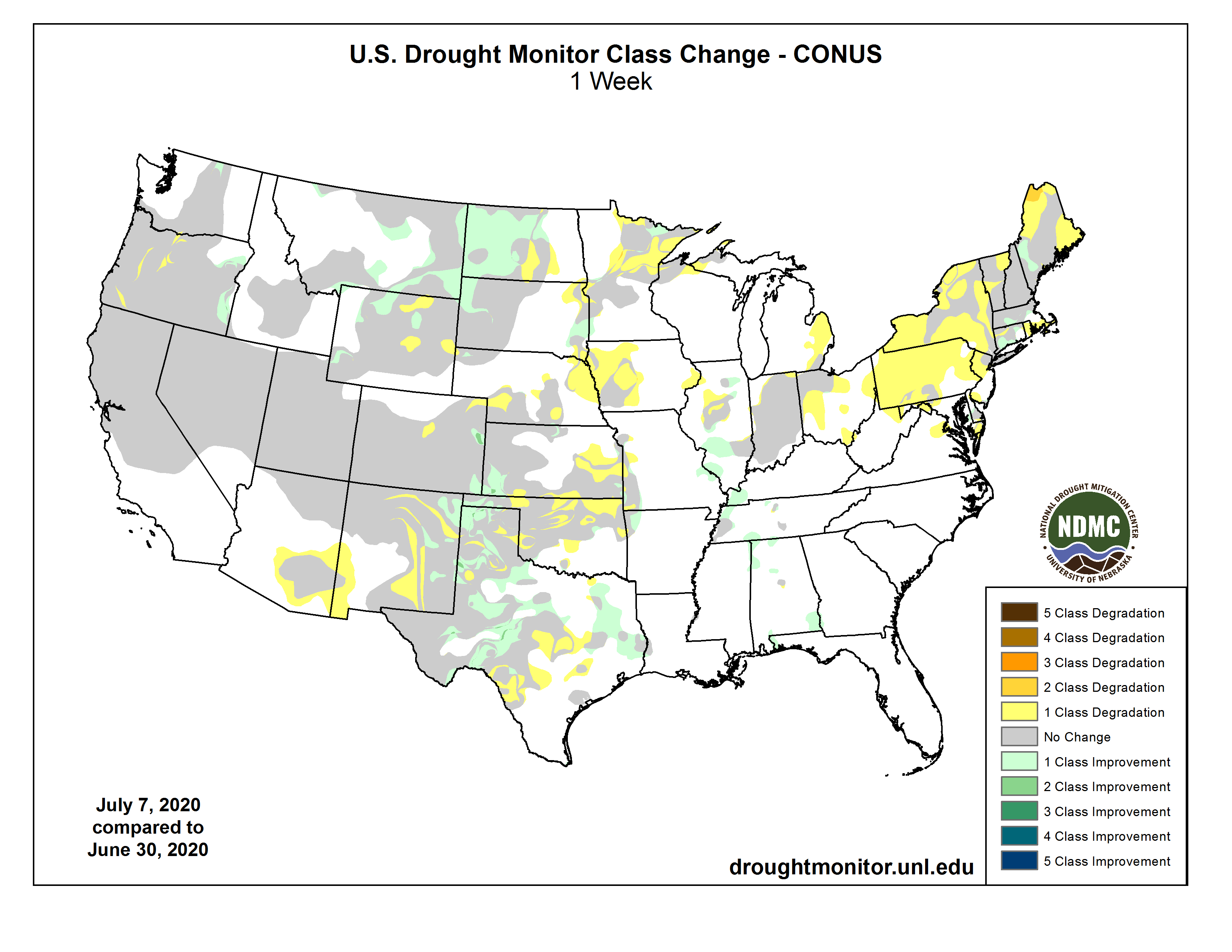 Seasonably dry but unseasonably cool weather prevailed over much of the West, with mostly light precipitation (less than 1 inch) limited to the northern Cascades, northern Rockies, and eastern New Mexico. With precipitation normal generally low during July (except for the southwest monsoon which should be ramping up soon) and temperatures below-normal, most areas were status-quo except for the following exceptions. In north-central Washington, field conditions had improved enough to warrant a slight improvement of D2 to D1 in Okanogan County. The winter and spring wheat crops in southeastern Washington, northeastern Oregon, and west-central Idaho, known as the Palouse, should be excellent with cool temperatures and adequate rains for a longer time than normal. In Oregon, some slight deterioration was made in the southwestern and north-central areas (D2 and D3 expansion), but continued wetness in the east called for some slight improvement of D1 and D0 areas. The slow and warm start to the southwest monsoon season in southeastern Arizona and southwestern New Mexico was depicted with an expansion of D0 there. In eastern New Mexico, although spotty light to moderate (0.5-2 inches) showers fell, most areas remained status-quo as longer-term conditions will need much more moisture for significant improvement. Only small areas in eastern New Mexico where the totals exceeded 2 inches were improved by 1-category. However, in central areas where the rains missed, D1 and D2 were expanded westward to reflect the continuing deterioration of ground and vegetation conditions…