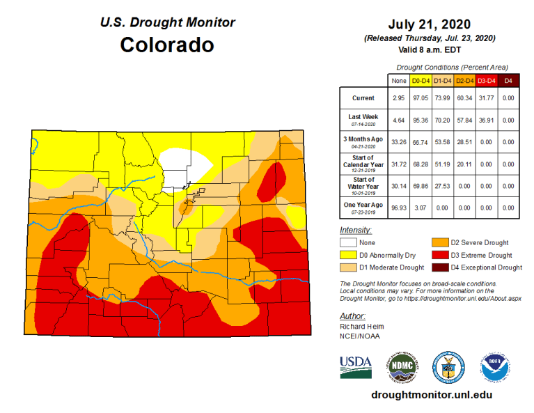 Overall, only three percent of Colorado is free from drought, down from five percent during the previous week. Abnormally dry conditions dropped two percent to 23, while moderate drought increased to 14 percent from 12. Severe drought increased to 29 percent from 21. Extreme drought fell five percent to 32. Seventy-five percent of Colorado is in moderate drought or worse. Numbers do not equal 100 percent due to rounding.