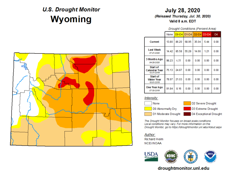 The latest data from the University of Nebraska’s National Drought Mitigation Center shows most of Wyoming is experiencing some level of drought. That ranges from moderate drought in the south and some eastern parts of the state to severe drought in the central region.