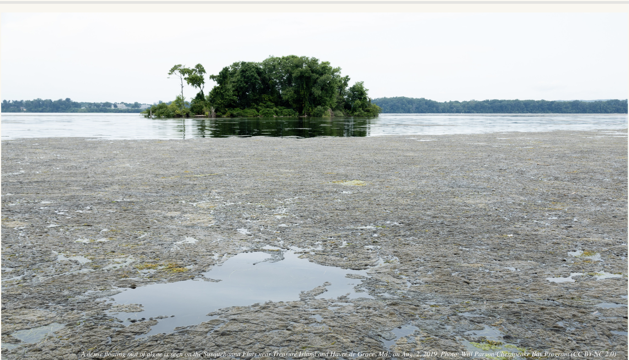 A dense floating mat of algae is seen on the Susquehanna Flats near Treasure Island and Havre de Grace, Md., on Aug. 2, 2019. Photo: Will Parson/Chesapeake Bay Program (CC BY-NC 2.0)