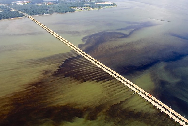 Aerial photo of an algal bloom in Virginia’s James River near the Monitor-Merrimack Bridge. Photo: Wolfgang K. Vogelbein, (CC BY-NC-ND 2.0)
