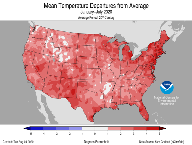 The July 2020 contiguous U.S. temperature was 75.7°F, 2.1°F above the 20th-century average and ranking 11th warmest in the 126-year record. For the year-to-date, the national temperature was 53.6°F, 2.4°F above average, ranking seventh warmest on record.