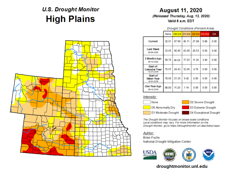 For autumn, the Climate Prediction Center’s outlook for September, October and November 2020 favors warmer than normal temperatures from western Kansas into the Rocky Mountain states. Precipitation points to wet (in North Dakota), however below-average precipitation is forecast for the Rocky Mountain states, southwest Nebraska, and the western half of Kansas and Oklahoma.