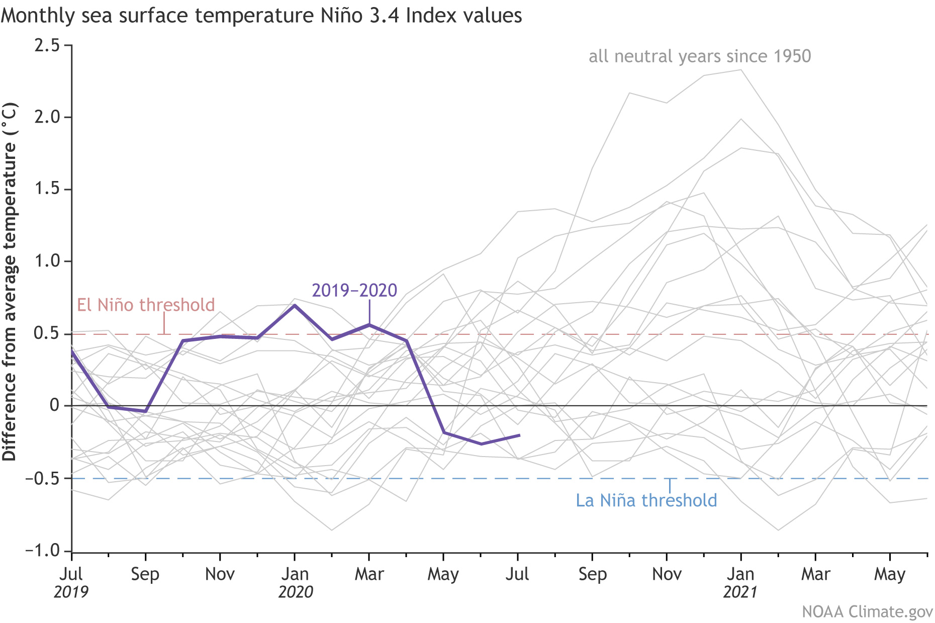 The Oceanic Niño Index—the three-month mean sea surface temperature anomaly (difference from the long-term mean, 1986-2015 in this case) in the Niño3.4 region—was -0.2°C during May–July 2020. The Oceanic Niño Index is our official metric for ENSO (El Niño/Southern Oscillation). -0.2°C is solidly in the “neutral” category of greater than -0.5°C and less than 0.5°C, so we continue in ENSO-neutral conditions for now.