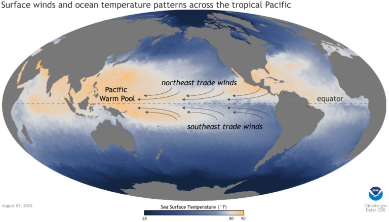 The Pacific warm pool and trade winds. NOAA Climate.gov map from the Data Snapshots map collection.