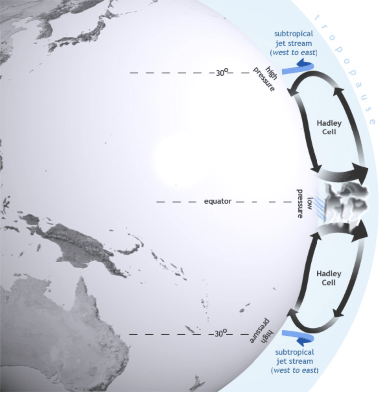 The Hadley circulation, in which heat is transferred from the Earth’s surface to the upper atmosphere through convection and latent heating. Map by NOAA Climate.gov.