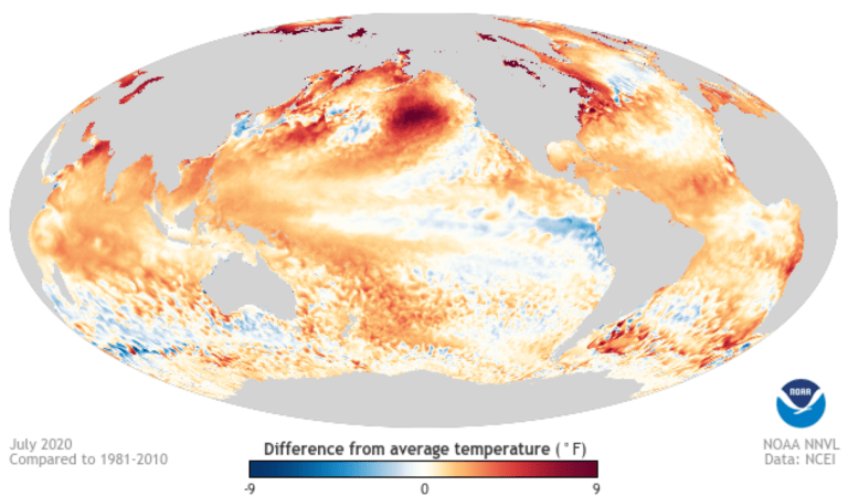 July 2020 sea surface temperature departure from the 1981-2010 average. Image from Data Snapshots on Climate.gov.