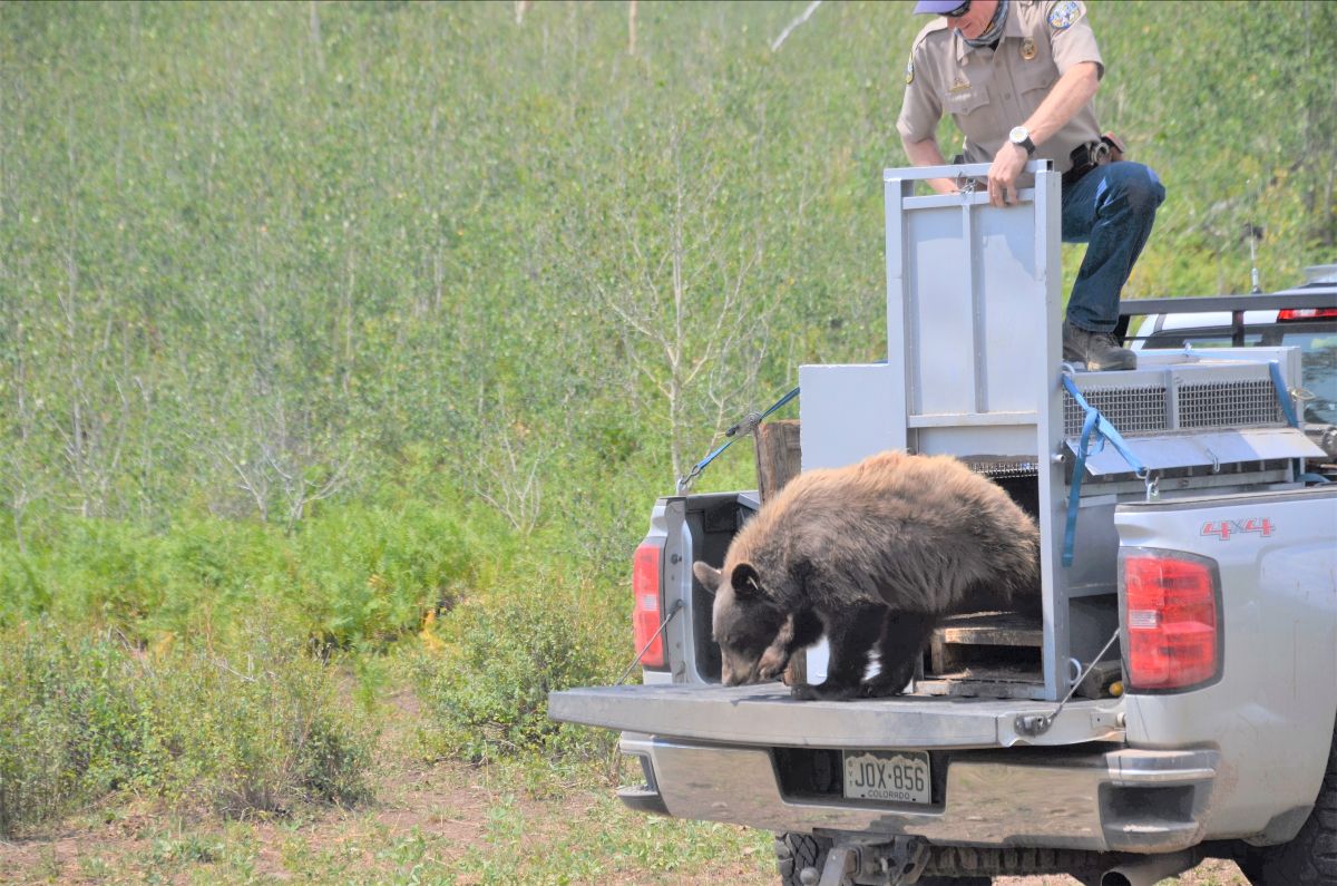 The bear was taken to a remote location not far from where it was found. The bear hesitated for about a minute while it sniffed its new surroundings. Then it jumped from the container in the back of a CPW pick-up truck and dashed into the thick cover of the aspen forest.