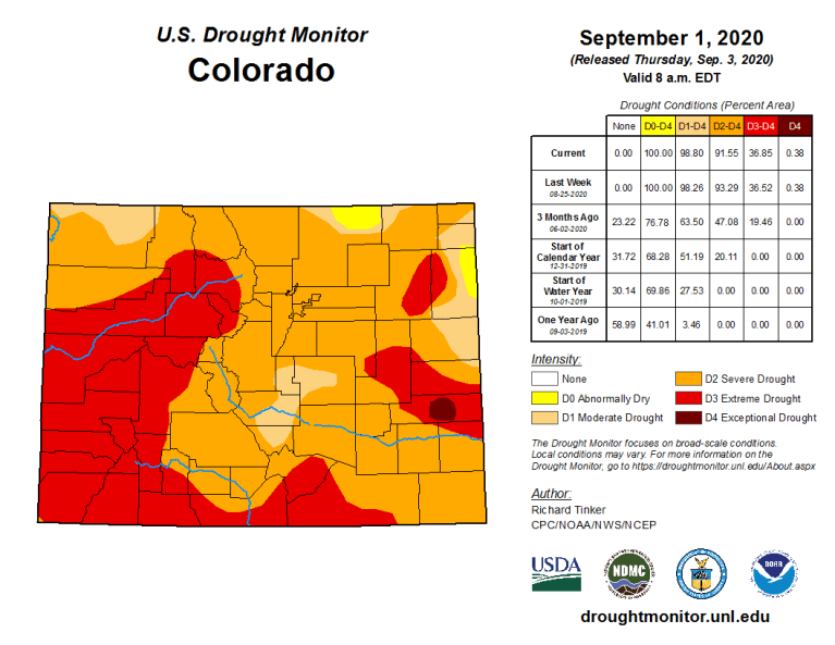 The outlook for September remains grim. Drought is expected to persist through the month, and the remaining abnormally dry areas in Weld and Yuma counties are expected to develop at least moderate drought over the coming month.