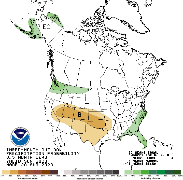 September 2020 temperature outlook via the Climate Prediction Center.September 2020 precipitation outlook via the Climate Prediction Center.