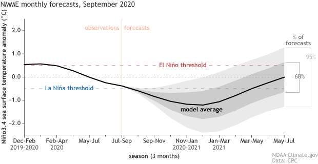The second step is “Do you think it will stay more than half a degree cooler than average for the next several months?” and again, the answer is “yes.” Most of the dynamical computer models predict that the sea surface temperature will remain below the La Niña threshold of -0.5°C through the winter.