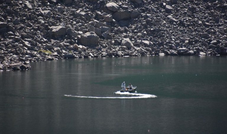 Workers administer the plant-based chemical compound rotenone at Upper Sand Creek Lake in the Sangre de Cristo range. The chemical kills all fish in the waterway so that Rio Grande cutthroat trout, a native species, had be restored to the habitat. (Provided by Colorado Fish and Wildlife)