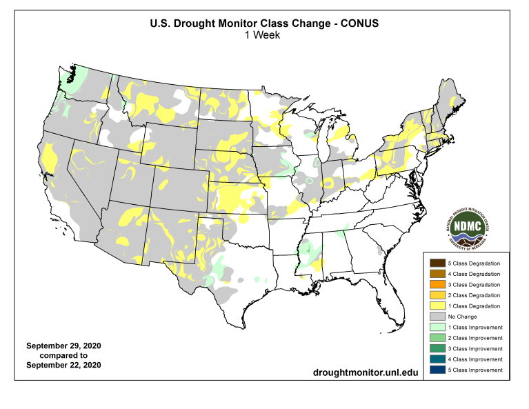 The remnant circulation of Tropical Storm Beta tracked across the area of abnormal dryness (D0) and moderate drought (D1) centered on Mississippi. September 21-24 rainfall topped 4 inches in locations such as Natchez, Mississippi (5.35 inches); Monroe, Louisiana (4.83 inches); and Texarkana, Arkansas (4.13 inches). Following Beta’s passage, D1 was eliminated from Mississippi. However, southeast of Beta’s area of influence, parts of eastern Mississippi saw mounting short-term precipitation deficits and a corresponding increase in D0 coverage. Farther west, parts of central Texas continued to benefit from recent heavy rainfall, while conditions rapidly worsened across the High Plains of Texas and Oklahoma. In fact, two new areas of exceptional drought (D4) were introduced in western Texas. Through September 29, year-to-date precipitation in Midland, Texas, totaled just 6.84 inches (59% of normal). In Texas’ northern panhandle, year-to-date precipitation had not yet reached the 9-inch mark in Borger and Dalhart. Borger’s 8.87-inch total was 48% of normal. On September 27, Texas led the country—among major production states—in cotton rated very poor to poor (35%). Oklahoma led the nation with 47% of its sorghum rated very poor to poor, according to USDA…