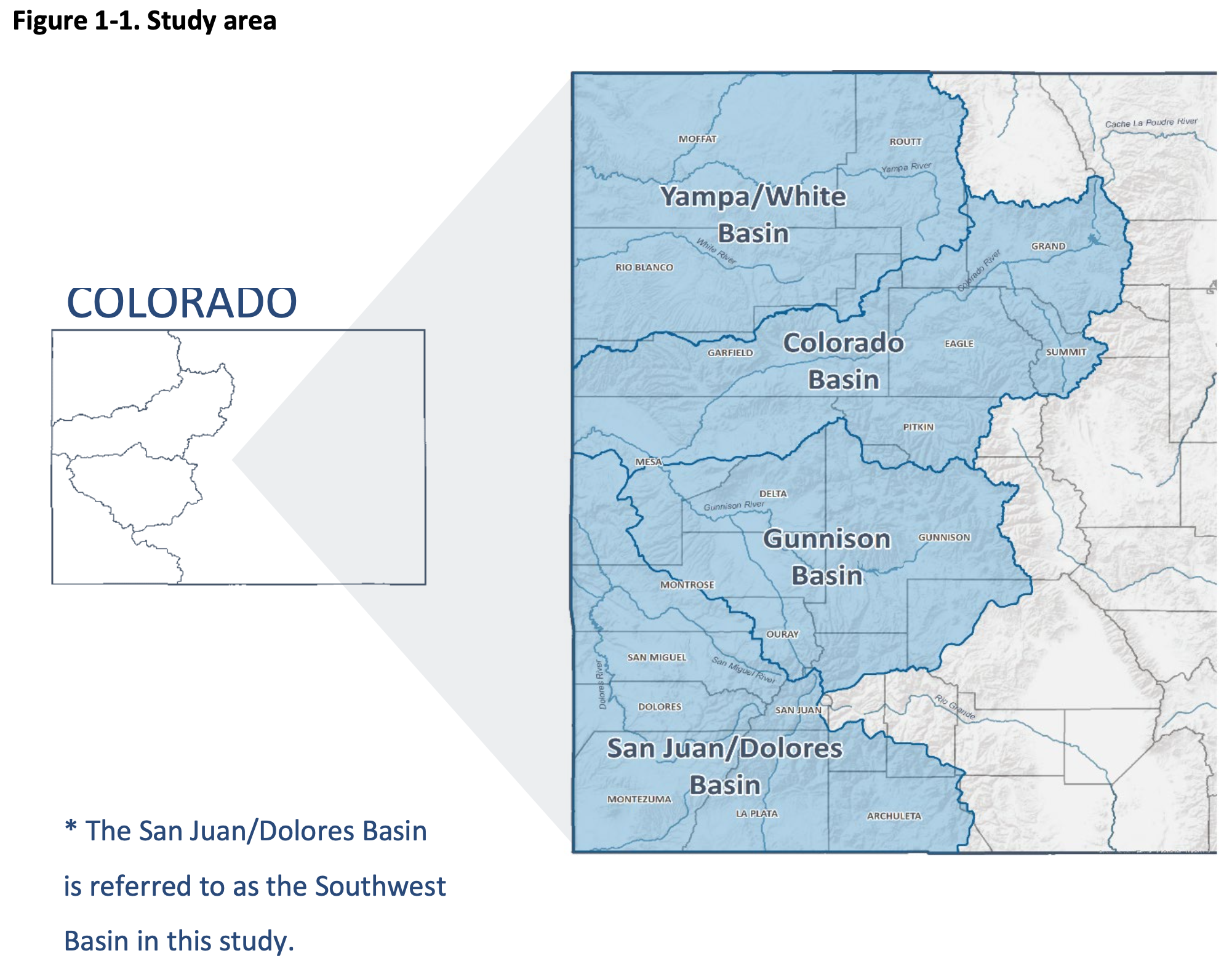 The Colorado, Yampa/White, Gunnison and Southwest basins were evaluated for secondary impacts of a demand management program that eventually could include the entire state. From the report: “Upper Basin Demand Management Economic Study in Western Colorado”. Source: Colorado River District