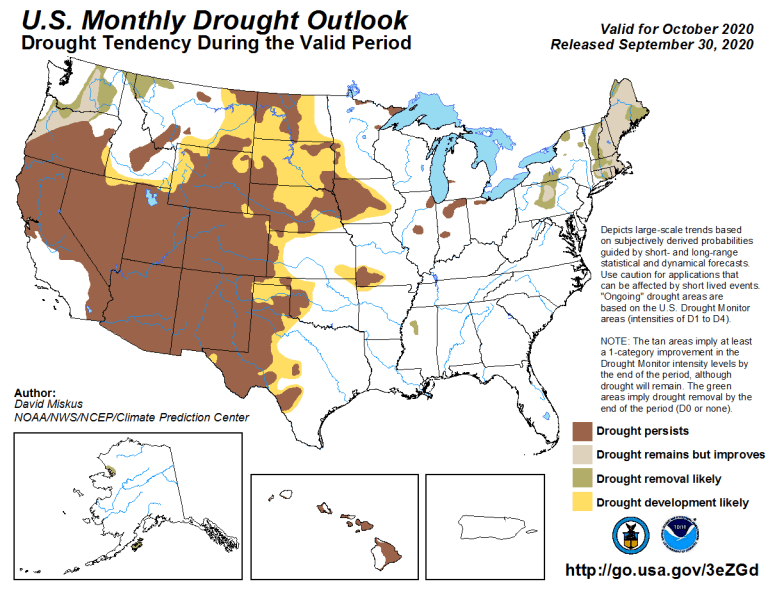October 2020 monthly drought outlook via the Climate Prediction Center.