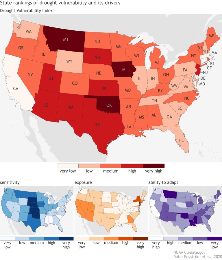 By this scoring system, the most vulnerable states are Oklahoma, Montana, and Iowa, while Delaware, Massachusetts, Connecticut, and California are least vulnerable to drought. Oklahoma gets its high vulnerability score from having an outdated drought plan and limited irrigation (low ability to adapt), as well as extensive agricultural activities and cattle ranching (high sensitivity). Despite facing recurring multi-year droughts (relatively high exposure), California ranks very low in drought vulnerability. Thanks to a strong economy and well-developed adaptation measures, it’s better prepared for an extreme drought when it occurs than most other states.