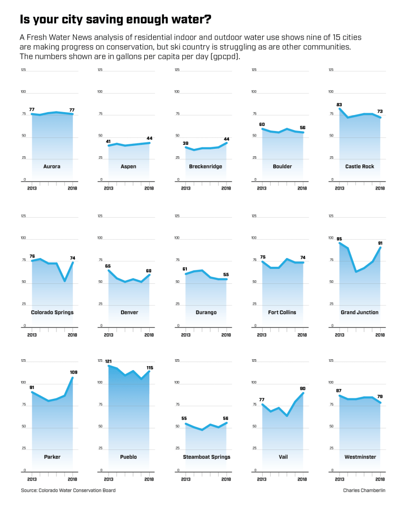For example, in 2013, the Vail region was using 77 gallons per person per day, according to the Fresh Water News analysis, a number that rose to 90 by 2018.