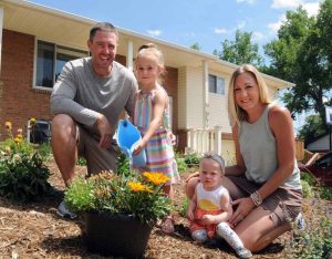 Kirsten Schuman, her husband, Max Schuman, and daughters Mayla, 11, and Eleanor, 1, stand in their newly installed landscape in the front yard of their home on July 30, 2020 in Castle Rock. The family won the ColoradoScape Makeover contest, which resulted in the new water-conscious landscape. Credit: Jeremy Papasso, special to Fresh Water News